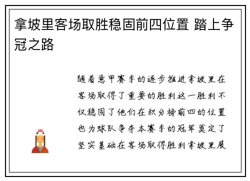 随着意甲赛季的逐步推进,拿坡里在客场取得...